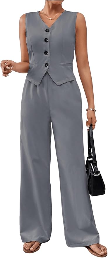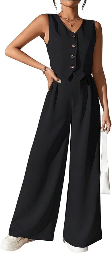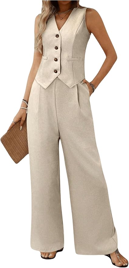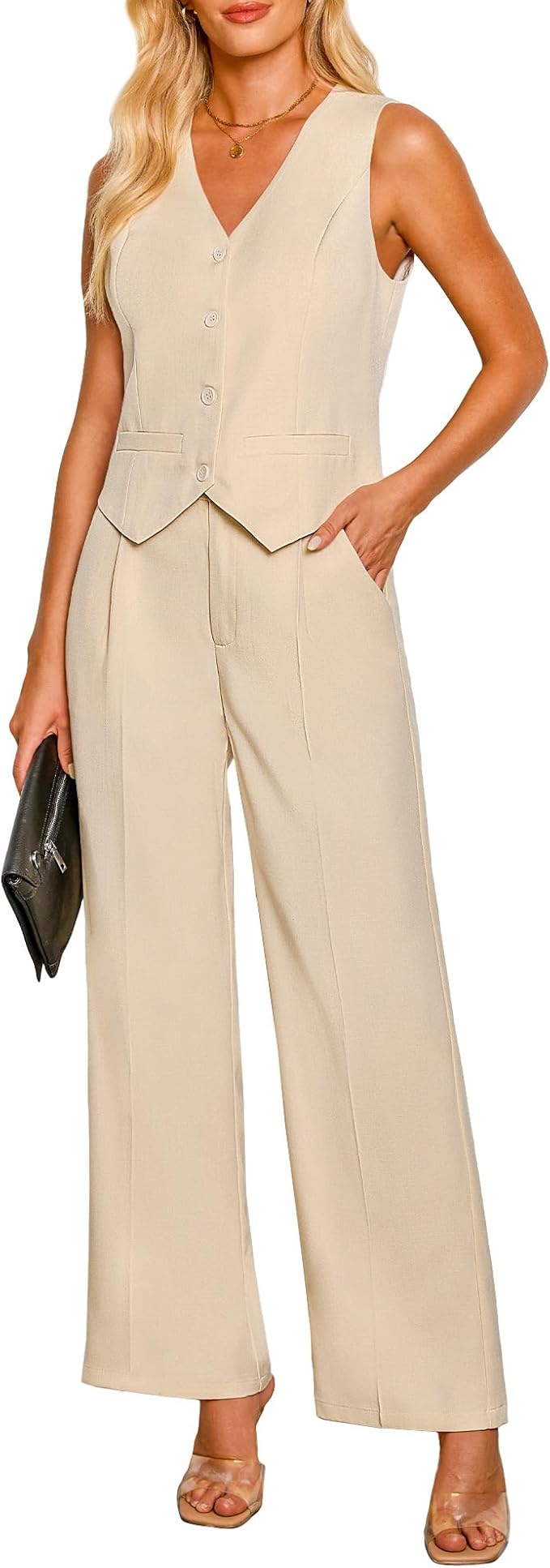 Women's Pant Suits Dressy 2 Piece Sets V Neck Button Down Sleeveless Blazer Vest Tops and Wide Leg Pants Sets