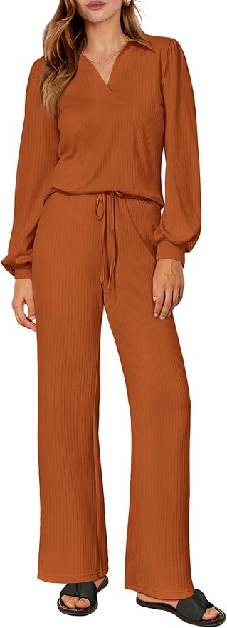 Womens Fall Clothes Two Piece Outfit Set Long Sleeve Lapel V Neck Tops Blouses Wide Leg Pants Ribbed Tracksuit