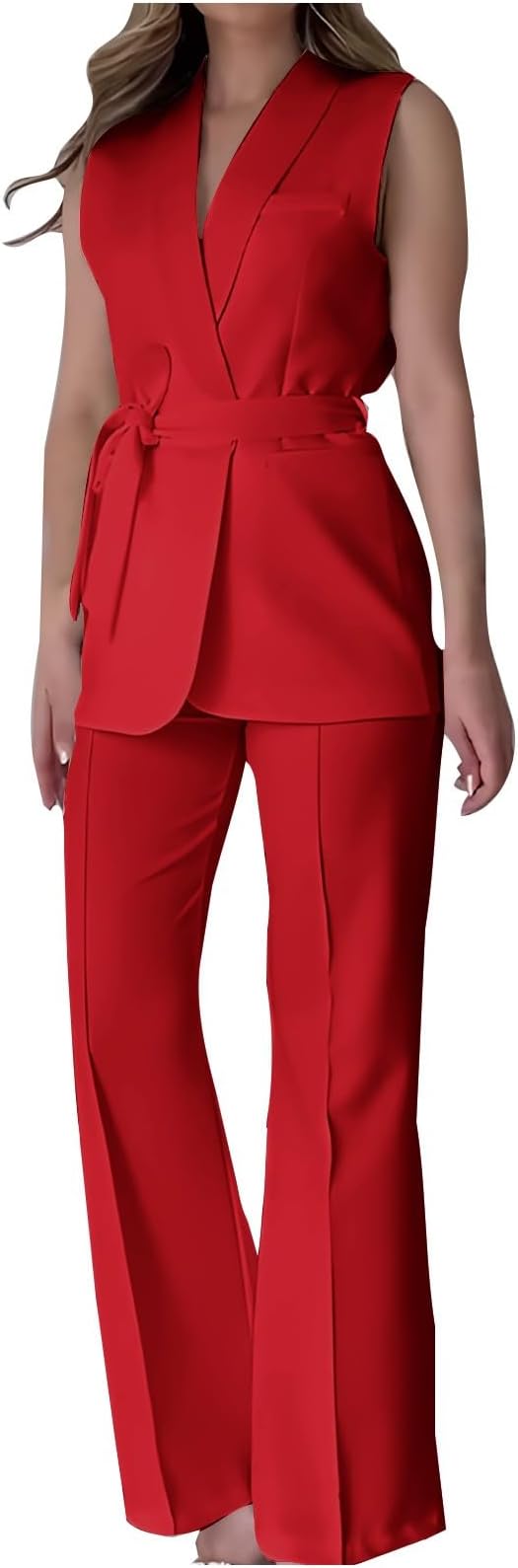 Women's Business 2 Piece Outfits Sleeveless V Neck Blazer Vest and Wide Leg Pant Sets Office Work Clothes with Belt
