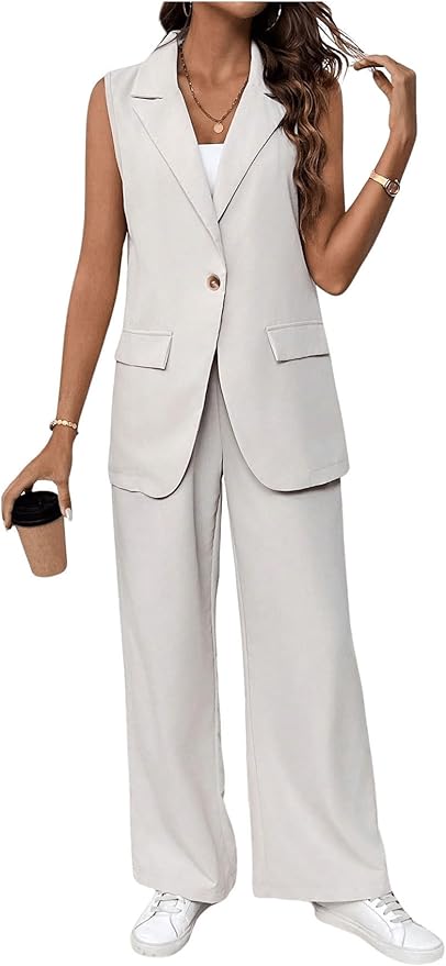 Women's 2 Piece Outfit Sleeveless Button Down Vest Blazer and Wide Leg Pants Suit Matching Set