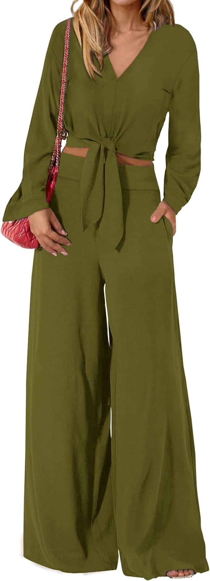 Women's 2 Piece Outfits 2024 Fall Casual Tracksuits V Neck Long Sleeve Strappy Crop Top Wide Leg Pant Sets