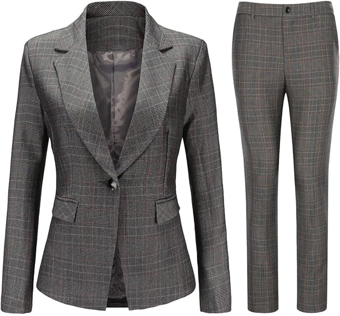 Women's Vintage 2 Piece Plaid Suit Set 1 Button Stylish Blazer and Pants