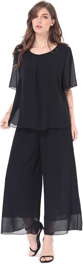 Women's 2 Piece Chiffon Sets Outfits Flowy Summer Casual Dressy Pantsuits Double Layers Blouse Capris Pants Suits