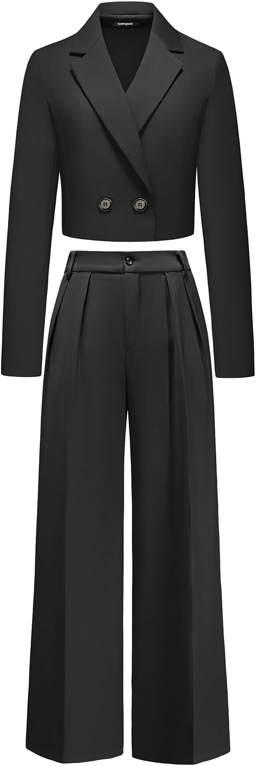Women's Suit 2 Piece Casual Outfits Cropped Blazer High Waisted Wide Leg Pants for Work