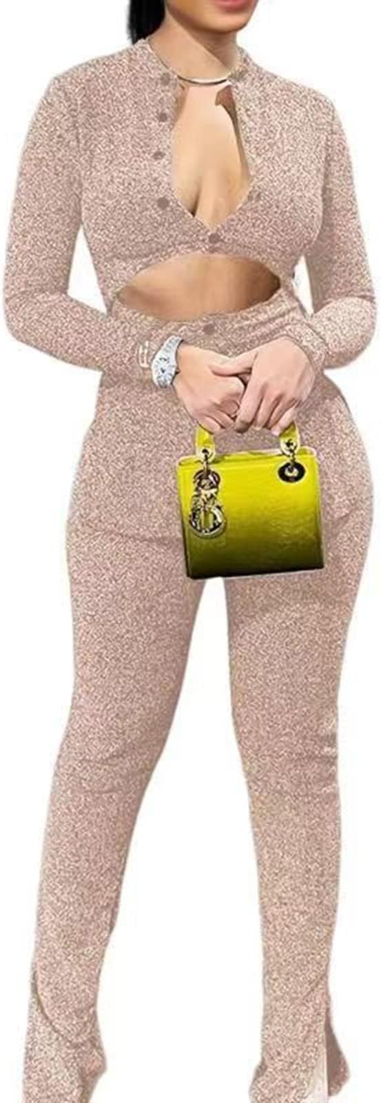 Womens 2 Piece Outfits Cut Out Casual Lady Business Suits Long Sleeve Slim Fit Sparkly Office Work Sets