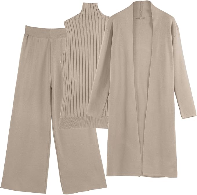 Women 3 Piece Outfits Loungewear Set Sleeveless Knit Tank Tops and Wide Leg Pants with Long Cardigan Coat Set
