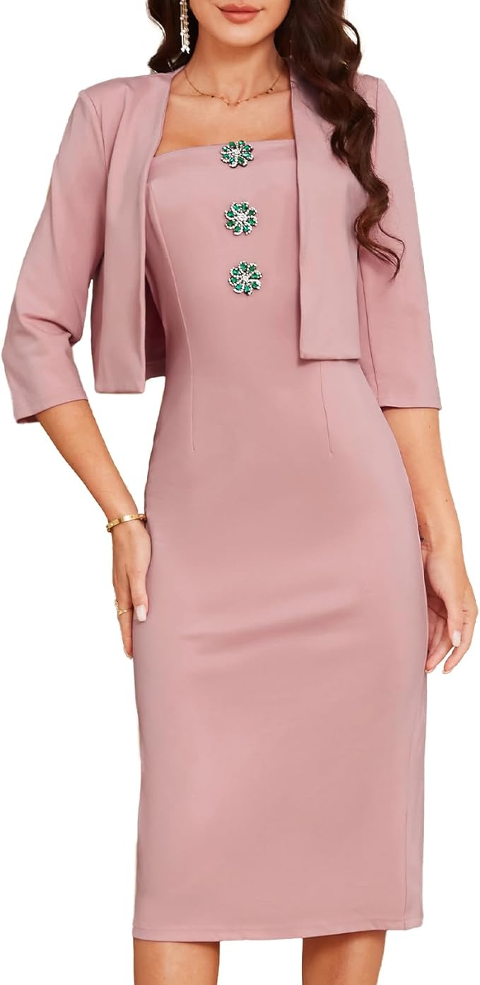 Women's Formal Dresses Office Business Work 2 Piece Outfits Midi Bodycon Dress with 3/4 Sleeve Jacket Suit Sets