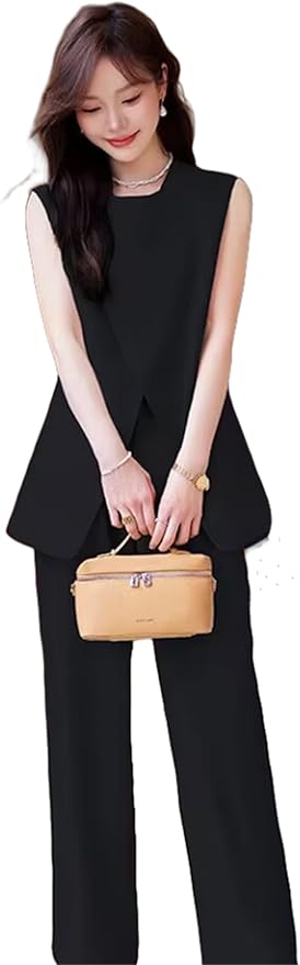 Women's Two Piece Premium Sleeveless Top Blazer Jacket Wide Leg Pants Set Business Summer Casual Suit