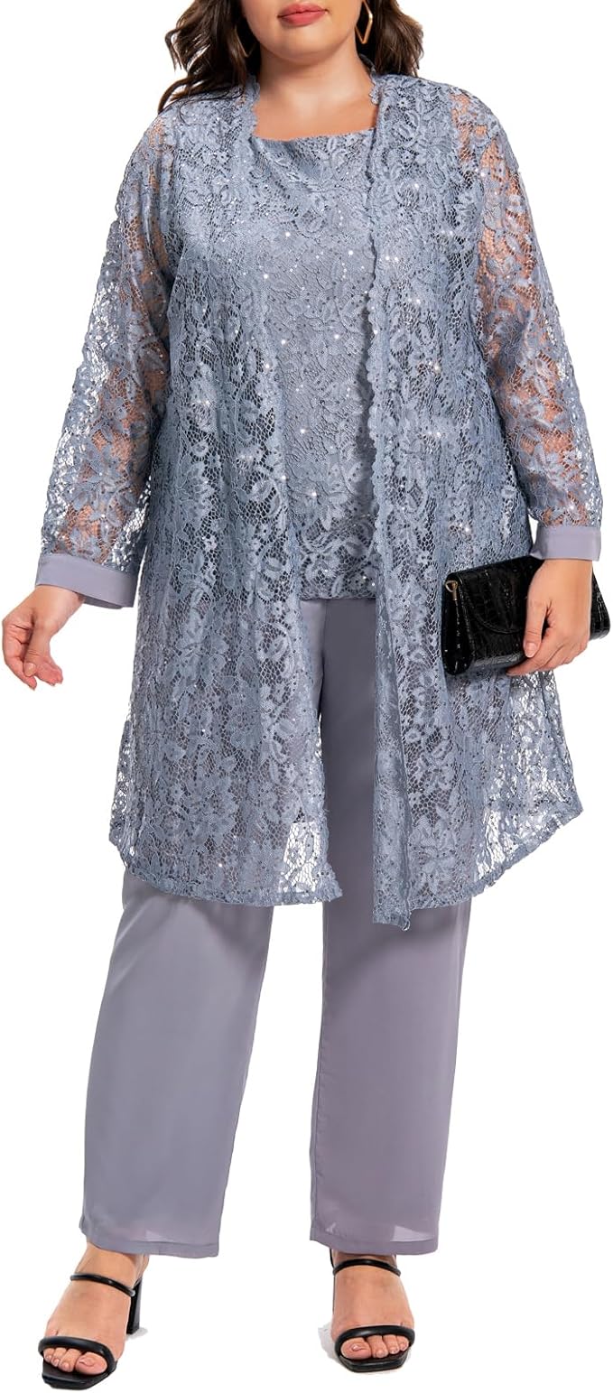 Plus Size Elegant Mother of The Bride Pant Suits Chiffon Pant with Women's Tank Top and Sequin Lace Jacket Evening Gown