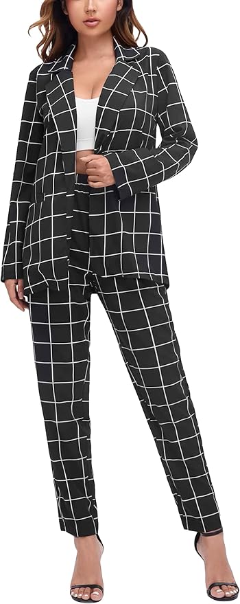 Women's 2 Piece Outfits Plaid Long Sleeve Open Front Blazer with Tapered Pants Suit Set