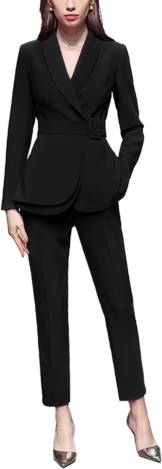 Women's Dressy Pant Suits Belted Asymmetrical Blazer Tops and Pencil Pants Wedding Outfits 2 Piece Formal Pantsuits