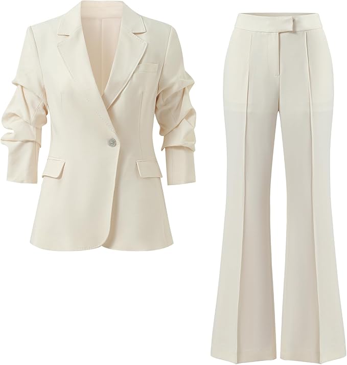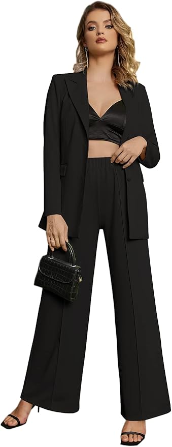 Women Suit Two Pieces Outfit Long Sleeve Business Casual Blazer Jacket with Wide Leg Pant Suit Set for Work