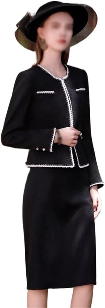 Tweed Set for Female Autumn Dress Formal Occasion Black Woven Coat(Large)