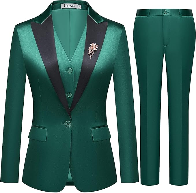 Women's 3 Pieces Satin Suit Black Peak Lapel Fashion Outfits Casual Party Wedding Blazer Jacket Vest Pants Set