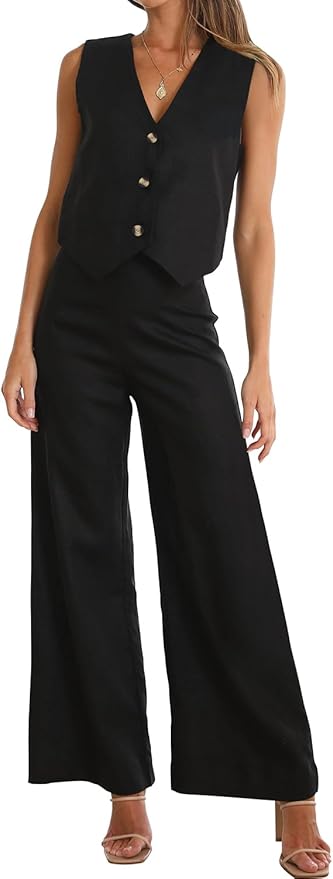 Women's Summer 2 Piece Outfits Button Down V Neck Sleeveless Top High Waisted Wide Leg Pants Matching Set